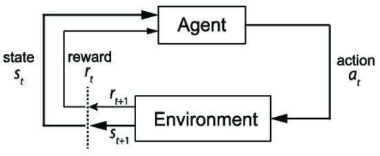 Reinforcement learning can be derived as a Markov decision process approach of an agent combined with the environment to maximize the final reward. In Figure 1, t is the time step and St is the current state (and current reward rt). The agent must learn a value function that yields the optimal decision or action at. The action will affect the environment that induces the next reward signal rt+1 and yields the next state St+1.