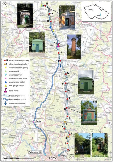 The city of Brno rapidly expanded at the end of the 19th century, which led to a search for a new water source. The search started in the 1880s and 1890s, targeting the town of Březová nad Svitavou, almost 60 km north of the city of Brno. Geological expertise and testing confirmed it as a vast and suitable source of groundwater with excellent water quality. In 1898, the city of Brno decided to carry out a technical and economically notable project of building a 57.5 km long water supply infrastructure—the Březovský Water Supply system I. The planning phase took place between 1896 and 1910, with the opening ceremony of the whole water system taking place in 1913. From that moment, the city of Brno has had a stable source of drinking water with a mean water flow of 250−300 L/s and, together with the Březovský Water Supply system II operational from 1975, a water flow of 1450 L/s [1,2].
