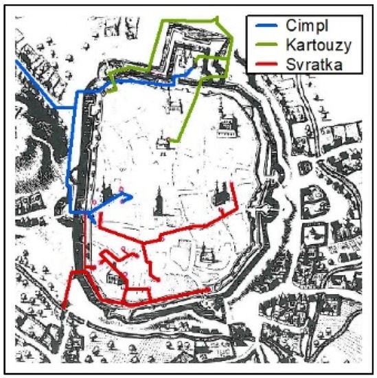 The three main water supply systems (Cimpl, Kartouzy and Svratka) in the center of the city of Brno at the end of the 16th century (according to [1]).