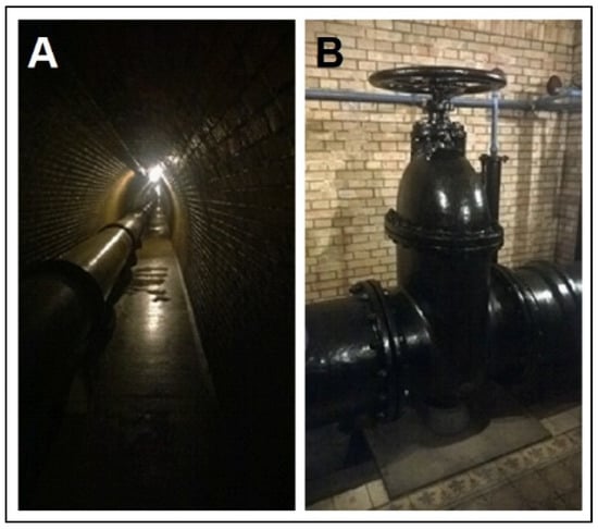The cast-iron pipeline of the Březovský Water Supply I—(A) in the water collection gallery, and (B) the water cap (photo: Honek D., 2019).