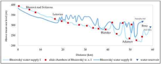Longitudinal profiles of both Březovský Water Supply systems (based on archived documents from the Brněnské vodárny a kanalizace, a.s. company).