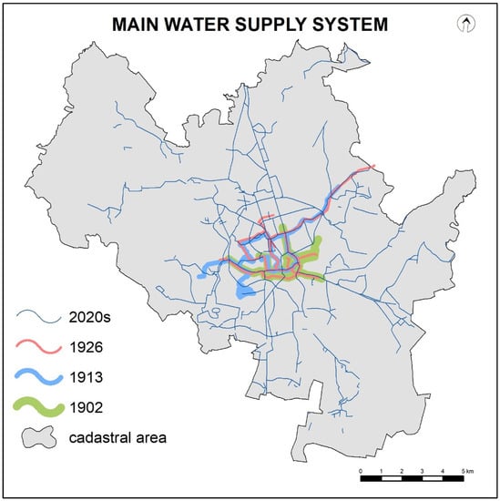 Development of the main routes of the water supply system of the city of Brno between the 1900s and 2020s [1,14]. Water supply system routes in 1902, 1913 and 1926 are only diagrams of a specific operating system at a given time without connection to other supply systems. The route in 2020 is based on ZABAGED database.