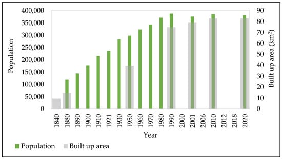 The city of Brno has developed dramatically during the last 200 years, and become the second most important city of the Czech Republic. The enormous expansion of the city was caused by the industrial boom in the 19th century, when the city became a center of the textile industry (the nickname “Moravian Manchester” was created) [18]. In addition, the engineering industry spread out, and the city of Brno became an important center in Central Europe. The city’s progression is evident from the development of the population together with the expansion of built-up areas in Figure 8; the increasing trend in both categories is obvious until the 1990s when it started to stagnate. This great development of the city would not have been so dramatic if two strategic things had not been secured—a stable source of drinking water and wastewater treatment.