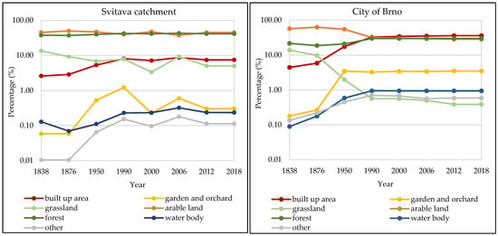 Land use changes of the Svitava catchment and the city of Brno (current cadastral area) between 1838 and 2018 (data before 1990 based on [25]).