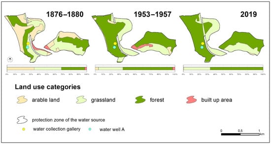 In the case of the water source in Březová nad Svitavou, the land use change is connected with the water source protection zone of the highest protection of 1st degree (Figure 10). The biggest changes occurred during the construction of the Březovský Water Supply system I between 1910 and 1913, when steep parts were covered by forest, and flat parts (mostly along the Svitava River) were covered by grass. A big part of the village of Muzlov was destroyed and its inhabitants moved away. The protection zone was extended by 50 hectares in 1938, and 2.5 km of riverbed was modified between 1935 and 1936 [1]. Modifications included the industrial center of the town of Svitavy being relocated higher up because there was a great danger of groundwater contamination by infiltration of the polluted water from the river. This threat remained until the construction of a WWTP in Hradec nad Svitavou (the WWTP for the whole Svitavy agglomeration) in the late 20th century. The last development of land use in the protection zone was connected with the end of the Second World War when Muzlov was completely destroyed and forested. This transformation was facilitated, among other things, by the displacement of the German population from the area after 1945. The current state of land use derives from the 1970s after the construction of the Březovský Water Supply system II.