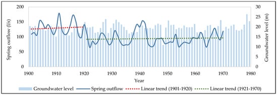 Development of outflow of the Sulkovy springs and groundwater level in the V2 well between 1901 and 1980 (according to [4]).