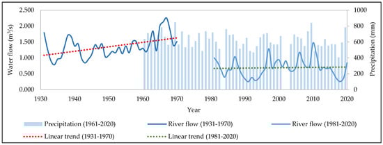 Consequently, the water flow of the Svitava River changed as well. Nevertheless, the data for a particular time period before 1930 does not exist in the case of river flow. A similar process of river flow reduction appeared after the commissioning of the Březovský Water Supply system II in 1975, which is presented in Figure 12. The decrease of water flow was from the original 1.35 m3/s to 0.69 m3/s (a reduction of almost 50%; Table 3). The change was great, although it had been taken into account before the construction of the water supply, and that is why the Letovice reservoir was built on the right tributary (the Křetínka River) of the Svitava River between 1972 and 1976 near the city of Letovice. The main purpose of the reservoir is the donation of the water flow volume of Svitava River, flood protection, production of electricity, and recreation [3,26].