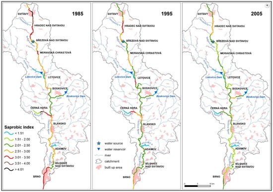 Zoobenthos was monitored through special monitoring of a dense network throughout the Czech Republic [10]. Thirty-six monitored localities were registered for the Svitava catchment area of interest. The saprobic index of zoobenthos was monitored regularly in five-year cycles and a uniform methodology of sampling, processing and calculation of the saprobic index [11] was used throughout. The values of the saprobic index correspond to the degrees of saprobility of water according to the overview in the table [11,12].