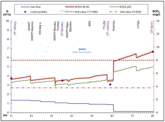 In 1995, there was a significant improvement in the oxygen regime, especially in the upper reaches of the Svitava River (Figure 13). The reduction of wastewater pollution from the town of Svitavy also contributed to the development of self-cleaning processes and the improvement of the quality of the flow through the Březová nad Svitavou water source. Overall, industry and agriculture in the whole catchment are in a slight decline during this period. The morphology of the river, its flow in a deep forested shaded valley further improves the oxygen conditions in the section below the town of Blansko. A clear improvement is also evident in the flow of the Svitava River through the city of Brno, where some operations were gradually closed or connected to the sewerage system.