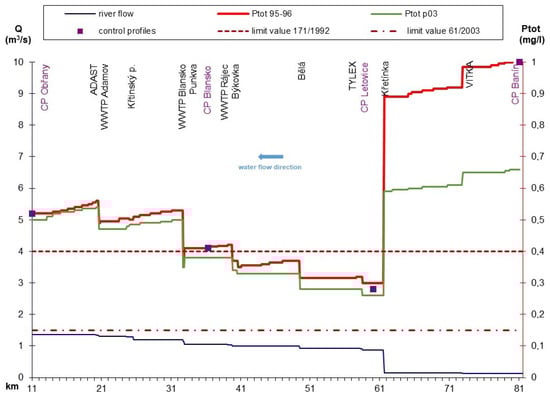 Figure 14 and Figure 15 document the course of pollution by organic substances (parameter BOD5) and eutrophic elements (total phosphorus−Ptot was chosen as a representative). Both the current situation in the mid-1990s (BOD5 95–96 and Ptot 95–96) and the prognosis of the possible development of river pollution after the introduction of appropriate measures (BOD5 p03 and Ptot p03) were modeled, especially the improvement of drainage and efficiency of wastewater treatment from settlements. It is clear from the courses that increasing the efficiency of WWTP treatment for the agglomeration of the town of Svitavy would lead to an improvement in the conditions in the upper section of the stream, which is also essential for the Březová nad Svitavou water source. That this happened is confirmed by the water quality map in the river basin in 2005 (Figure 13). The course of pollution of the Svitava River also shows the significant effect of improving the flow regime and diluting pollution by discharging water from the Letovice reservoir. Thanks to this measure, self-cleaning was (and is) being supported up to the industrial area above the city of Brno (between the town of Blansko to the town of Adamov).