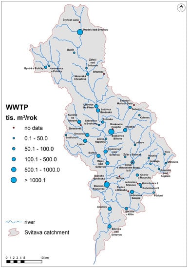 Wastewater treatment plants of the Svitava catchment in 2020 (outflow data based on Odběry a vypouštění web application administrated by the Ministry of Agriculture).
