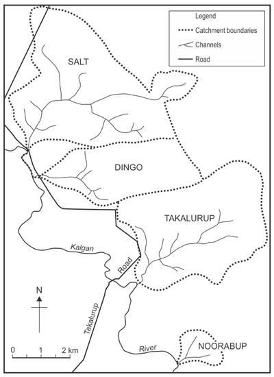 The study area is first explicitly mentioned in the reports of European explorers in December 1831, when surveyor Raphael Clint described ‘tolerable’ soil near a stream that Aboriginal people called Ta-kel-e-up (Takalarup), where the water was brackish [25]. Brackish and highly saline water was also found in pools in the Kalgan River at Coon-bil-up (Kamballup) nearby. From experiences elsewhere in the catchment, early summer stream salinity followed poor winter rainfall. Presumably, saline groundwater inflow to the streams were not diluted by surface runoff. The clearing of native vegetation for agriculture and pastoralism reduced evapotranspiration, leading to outcrop of the saline water table and, therefore, surface salinization. This leads to the death of remaining vegetation and resistance to soil erosion is reduced.