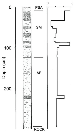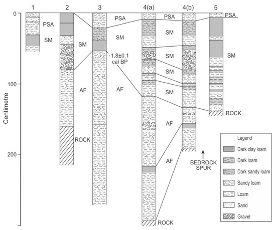 At nine of the cross sections (1, 3, 4(a) and 4(b) which are 23 m apart either side of 4, and cross sections 5, 6, 7, 8, 10) the top of the profile consists of a pale brown to yellow brown laminated sandy loam and fine sand with gravel in cross section 10 (Figure 3). At cross sections 1 and 3, this layer contains the bones of sheep and pieces of fencing wire, showing that it is of post-European age. It is equivalent to the PSA described from southeastern Australia [23] and the U.S.A. [36].