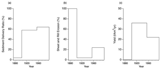The response curve of sediment yield from disturbed catchments rises rapidly as incision begins, then falls to a new value that is usually higher than that of the pre-disturbed state [9,23,45]. The budget approximately resolved for different time periods in the Takalarup catchment (an example of Type B) provides additional information. Prior to 1903, when the native vegetation was intact, the yield was very low, and the only erosion was by sheet and rill processes. The SDR was also very low, so the catchment was a sediment trap (Figure 7).