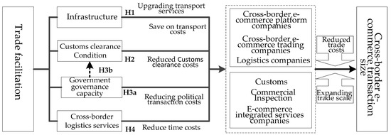 In view of this, the present paper constructs a conceptual model of the impact of trade facilitation on cross-border e-commerce transactions by taking cross-border e-commerce transactions between China and the countries along the “Belt and Road” as the research object. Based on this model, we use panel data to examine the differences in the impact of trade facilitation measures on cross-border e-commerce transactions in terms of infrastructure, customs clearance environment, government–governance capacity, and cross-border logistics services on the scale of cross-border e-commerce transactions in the countries along the “Belt and Road”.