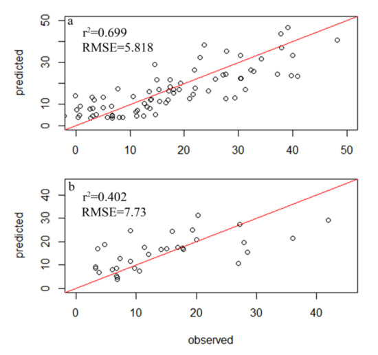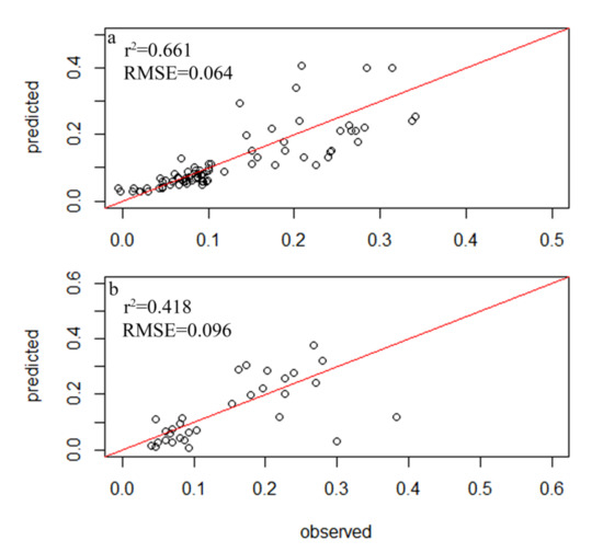 Relationship between the observed and diatom-inferred COD obtained via weighted averaging without tolerance down-weighting regression: (a) test group; (b) control group.