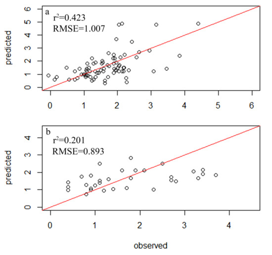 Relationship between the observed and diatom-inferred TN obtained via weighted averaging without tolerance down-weighting regression: (a) test group; (b) control group.