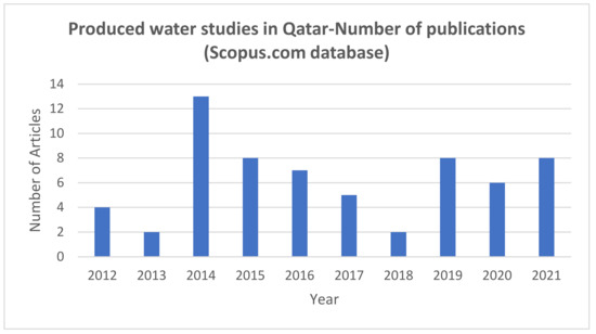 The number of articles (by year), where the expression ‘produced water Qatar’ was found in the title, abstract, or keywords, in the last 10 years. Data extracted from the scopus.com database (5 December 2021).