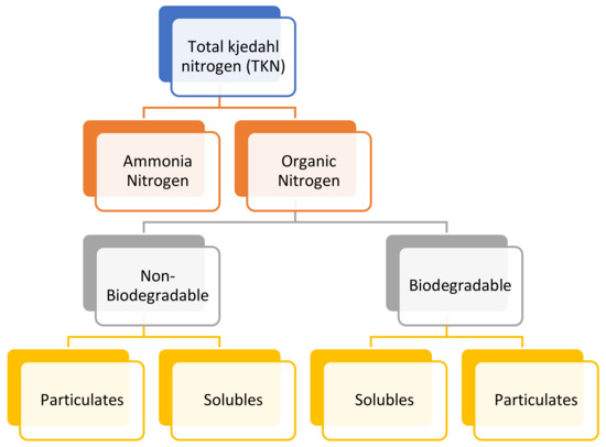 Total Kjeldahl Nitrogen is the total concentration of organic nitrogen and ammonia. TKN is a method to determine the total nitrogen in an organic substance, involving inorganic compounds such as ammonia and ammonium (NH3/NH4+) in water. This method was established in 1883 by Johan Kjeldahl. The nitrogen constituents and their relationship are shown in Figure 2 [81].