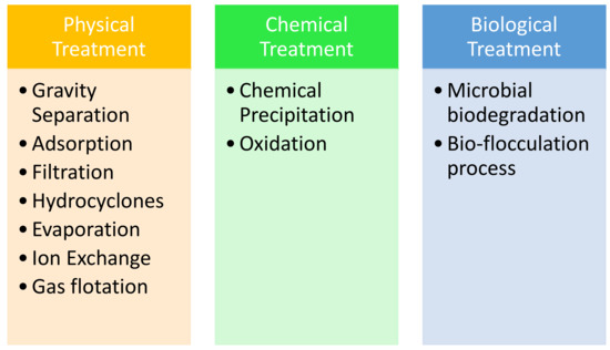 Usually, in order to reach the environmental standards of treated water, two or more technologies are necessary to be combined to reach reasonable results. Techniques employing one technology will not be sufficient to treat PW and be acceptable, as per all global environmental standards [104]. Several stages with specified treatment processes are used to treat the pollutants in PW. Initially, physical treatment can be performed where the physical process is performed to remove solid and biomass without using chemicals or bacteria such as filtration. The second stage is a chemical treatment applied to remove the specific chemicals dissolved and suspended particles that are not able to be eliminated from PW through physical treatments. However, chemical treatments require additional costs for the chemicals used in flocculation and coagulation. The last stage is biological treatment using bacteria to remove the biodegradable material.