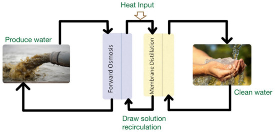 The mass transfer system can be controlled by partial vapor pressure alteration owing to a temperature difference. The difference in the temperature ranges between 10 to 20 °C (warm and cold streams), and is adequate to obtain distilled water at the specific conditions. Membrane distillation is highly important for treating the salinity feed waters and reducing the salinity of PW [49]. Furthermore, MD in comparison with reverse osmosis is better in obtaining good, distilled water quality, which is not affected by high salinity. The RO system requires multiple passes, while MD uses a single pass to reach desired salt rejection, and uses low-grade waste heat, economic system. In the MD system, there are four main module configurations: air gap (AG), vacuum MD (VMD), direct contact MD (DCMD), and sweeping gas MD (SGMD) [56]. Minier-Matar, J. et al. [56] used flat sheet membranes with 0.014 m2, sandwiched between the feed and distillate plates to treat PW. The results showed that the membrane was not affected by salt concentration, and the flux was stable. In addition, MD produced a high-quality distillate of brines from thermal desalination plants. For better efficiency, the MD process can be combined with some other membrane-based processes (Figure 5).