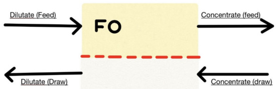 FO is an osmotic process that uses a semipermeable membrane to treat PW by separating it from dissolved solutes. The osmotic pressure gradient is the main factor acting as the driving force between a high (draw) and low (feed) concentration solutions (Figure 6). Moreover, the osmotic pressure gradient is important for implementing a net flow of PW within the membrane into the draw, therefore successfully concentrating the feed. The feed solution is either a dilute product stream, seawater, or a waste stream, while the draw solution is a solution particularly tailored for forward osmosis applications or a single or multiple simple salts [111]. Noteworthily, FO is usually preferred as a “pretreatment” process to directly treat feed wastewaters in view of practical water production applications [63]. The membrane support layer controls the antifouling capability of the FO membrane, which also performs the function of allowing water permeation and rejecting pollutants simultaneously. Mainly, two conditions must be included in any super-antifouling support layer, superhydrophilicity and ultra-smooth conditions, in order to reduce the hydrophobic adsorption of foulants on membrane surface. Furthermore, the ultra-smooth conditions will prevent the clogging of foulants [63,112]. Conventional support layers contain a tortuous 1D architecture, known as the internal concentration polarization (ICP) phenomenon. ICP functions as a stable barrier against the diffusion of water molecules and draws solute. Moreover, the construction of 3D architecture with organized pores in the membrane backing the layer will effectively overcome the ICP bottleneck [113].