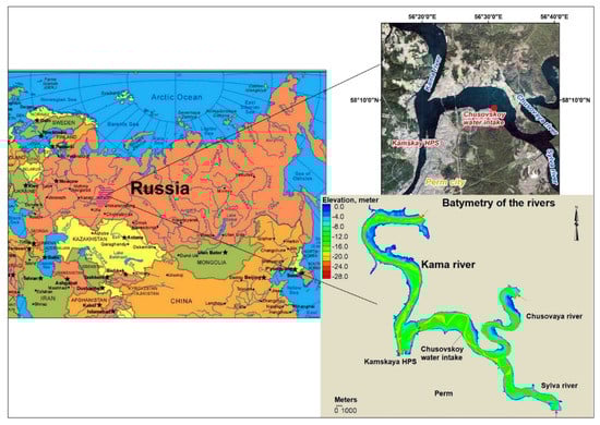 For the city of Perm, the hydrodynamics of the upper pool of the Kamskaya HPS is of particular importance because the main intake of potable water in Perm (the Chusovskoy water intake) is located just in this region (Figure 1). For the first time, the peculiarities of the structure of flows and hydrochemical fields formed in the upper pool of the Kamskaya hydroelectric complex were considered in the framework of computational experiments by [15]. The influence of non-uniformity of water discharge regime on the hydrodynamic regime of reservoirs was also studied by [17].