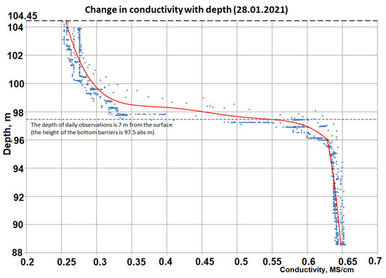 In order to achieve the goal, namely, to estimate changes in dynamic (velocity and direction of flows) and physical (electric conductivity of water) characteristics of the flow in the location area of the head of the Chusovskoy water intake, we conducted a series of field observations. The first stage of this work involved the study of changes in the specific electrical conductivity along the depth of the reservoir at the location of the heads of water intake system. The results of the measurements are presented in Figure 2. It is seen that water masses in this section of the Kama reservoir area exhibit considerable vertical inhomogeneity, which is caused by the confluence of the Sylva and Chusovaya rivers, about 25 km upstream from the dam of the Kama reservoir. Further, the instrument was adjusted to autonomous operation and submersed to a depth of 7 m—the depth of water intake by the heads of the Chusovskoy water intake. The autonomous operation time of the device was 23 h. The results of these measurements were used to construct time dependences of velocities and directions of flows, as well as the specific conductivity (Figure 4 and Figure 5). The formation of stable vertical stratification of water masses in the Kama reservoir in winter season were considered and described by [15]. The main reason for the observed stratification being a large difference in the water salinities (and, accordingly, in the hardness) of the Sylva and Chusovaya rivers in winter season. The position of the density jump layer at a depth of 7 m was determined first by the water level maintained in the reservoir, and second, by the ratio of the flow rates in the Sylva and Chusovaya rivers. Long−term observations have shown that this position is quite stable.