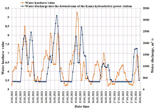 The strong impact of hydrodynamic characteristics on the quality of water intake at the Chusovskoy water intake determined by computation is confirmed by the superimposed graphs of the flow rate dynamics of water discharge through the dam of the Kamskaya HPS and the hardness of water withdrawn at the Chusovskoy water intake, presented in Figure 11.