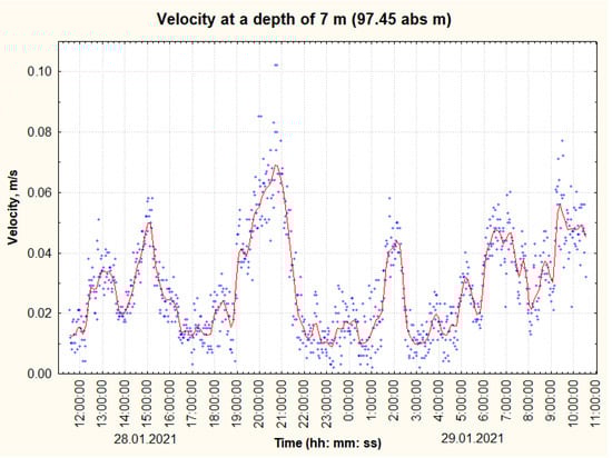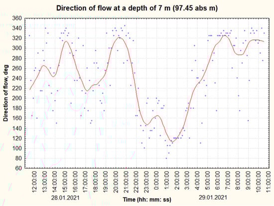 Figure 4 shows the variation of the velocity modulus over a 24-h period. Fluctuations in the range of 0.01–0.08 m/s are associated with certain phases of forward and backward waves generated due to the intraday non−uniformity of water discharge by the Kamskaya HPS. The presence of the above−mentioned waves is substantiated by the flow direction measurements. As can be seen from Figure 4, the main fluctuations are in the range of 120–340 degrees, i.e., within 24 h the flow direction at the point of measurement changed up to the opposite one.