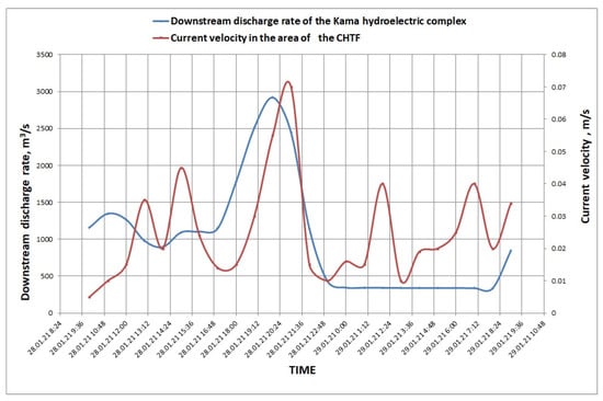 The hydrodynamic characteristics measured in the vicinity of the Chusovskoy water intake heads are compared with the flow rates of water discharge through the dam of Kamskaya HPS averaged over hours in Figure 7. The comparison clearly demonstrates that the water discharge through the dam of the Kamskaya HPS plays a decisive role in the formation of hydrodynamic regime in this particular section of the reservoir. At the same time, it is necessary to take into account the fact that the upper pools of large hydroelectric power stations are complicated non−linear oscillatory systems excited by a significant intraday non-uniformity of water discharge. The non−linearity of such oscillating systems can generate significant secondary flows of complex nature.