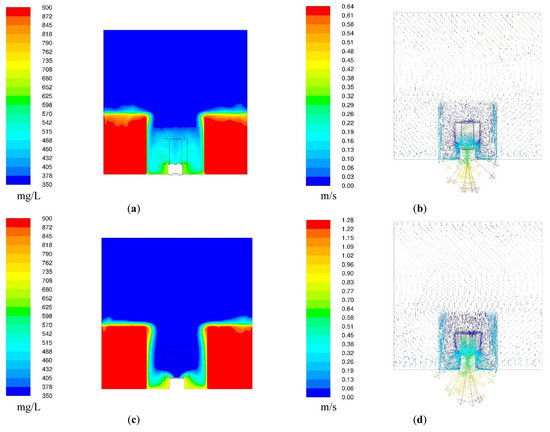 In this series of computational experiments, it was assumed that the layer of density jump is located 0.5 m above the upper mark of the bottom barrier. Since the flow rate of water withdrawal through a single intake head can vary considerably, it seems reasonable to first investigate the impact of the intake flow rate on the water quality. The results of computations under the assumption of zero velocity of the river flow are shown in Figure 8. The impurity concentration fields (a,c) and velocity vector fields (b,d) are shown in the vertical section in the middle of the computational domain.
