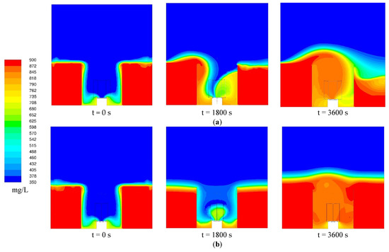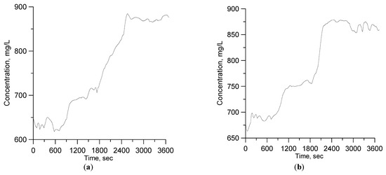The temporal evolution of the maximum mineralization of the withdrawn water in the presence of bottom barriers for the flow rate of water withdrawn through a single intake head: 2 m3/s (a), and 4 m3/s (b) at the velocity of the river flow varying from 0 m/s to 0.1 m/s within 1 h.