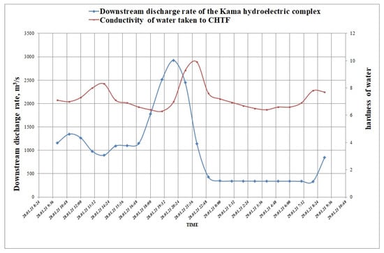 Superimposed chronological graphs of water discharge into the lower pool of the Kamskaya HPS and measured water hardness in the Chusvskoy water intake area.