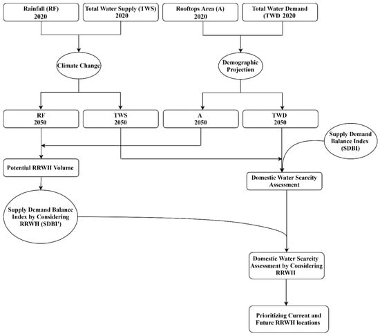 The methodology adopted in this research is illustrated in Figure 1. It includes two phases. It starts by identifying and quantifying the total water supply (TWS) in (million cubic meters/year), the total water demand (TWD) in (million cubic meters/year), and SDBI. The second phase focuses on estimating the potential RRWH volume in (million cubic meters/year) and its effect on the SDBI. Both phases are carried out for 2020 and 2050.