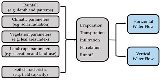 The schematic overview of the SVAT model is shown in Figure 2. First, the model considers the different inputs. Then, characterizing the infiltration, percolation, interception, transpiration, and runoff is carried out. Finally, the vertical and horizontal water flow is estimated at the different time steps [].