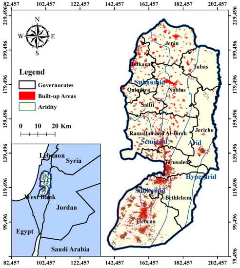 This paper aims to analyze the capacity of rooftops rainwater harvesting (RRWH) in addressing the domestic water scarcity in arid and semi-arid areas, such as the West Bank in Palestine. Domestic water scarcity is defined as the inability of available freshwater to satisfy the needed domestic water demand []. According to the World Health Organization (WHO), such scarcity adversely affects water consumption and hygiene []. Areas suffering from domestic water scarcity are classified as risky to human health []. This scarcity increases the spread of infectious diseases (e.g., influenza, Ebola, and SARS) that could be controlled by adopting the needed washing and hygiene measures [,,]. The U.N. Sustainable Development Goal (SDG-6.4) expressed the necessity of decreasing or even eliminating the number of people affected by domestic water scarcity []. Domestic water scarcity is of increasing concern globally, especially in arid and semi-arid areas []. This could be attributed to the increasing water demand and the vulnerability of water resources under climate change [,,]. In the West Bank, Palestine, the domestic water supply–demand gap reached 58 million cubic meters/year (40% of the water demand) in 2018 [].