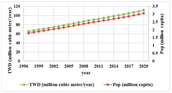 Data are collected from different sources. The building rooftops shapefile in 2020 is obtained from the Ministry of Local Government (MoLG) []. The historical and current population statistics are collected from the Palestinian Central Bureau of Statistics (PCBS) []. WHO recommended a DWCR of about 100 L per capita per day (l/c/d) []. Accordingly, Equation (1) is used for the estimation of historical and current TWD for the whole West Bank. Figure 4 shows the increasing trend in population and TWD. Population increases from 1.78 million capita to 3.05 million capita, and TWD increases from 65.2 million cubic meters/year to 111.4 million cubic meters/year between 1997 and 2020.
