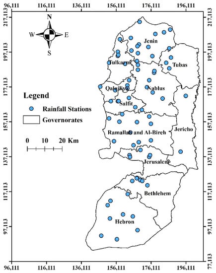 The proposed methodology is applied to the West Bank, Palestine, which is located to the west of the Dead Sea (Figure 3). It covers 11 governorates with 5860 km2 and about 3.12 million inhabitants []. A significant variation in RF among the governorates is indicated []. Since most governorates have independent water systems [], this research is conducted at the governorate scale.
