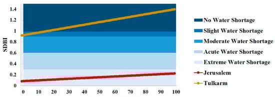 SDBI values and water scarcity levels in the West Bank governorates in 2020.