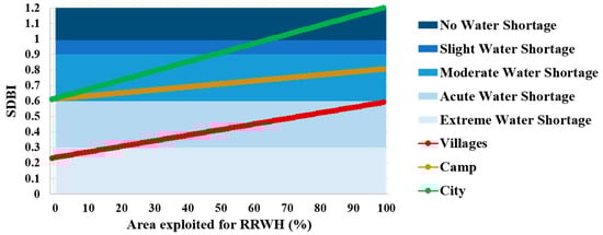 This section discusses the RRWH efficiency at different urban scales (city, village, and camp), emphasizing the Jenin governorate in 2020. Figure 8 shows that the full adoption of RRWH in Jenin can change the water scarcity status from “acute water shortage” to “no water shortage”. Furthermore, this full adoption can change the water scarcity status in (i) Jenin Camp from “acute water shortage” to “moderate water shortage” and (ii) in villages from “extreme water shortage” to “acute water shortage”. These results indicate that the lowest RRWH efficiency concerns the Jenin camp. The variation of the efficiency of the potential RRWH is related to the ratio of the rooftops to the population. This ratio equals 16 m2/citizen in the camp compared to 29 m2/citizen and 48 m2/citizen in the villages and the city, respectively.