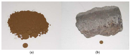 Table 1 exhibits the physicochemical properties of the dust before the ISV treatment; Figure 1 shows the exterior of the dust before and after the ISV process. Table 1 demonstrates the dust as a strong alkali with a pH value of 11.68, which was contributed by the electric arc-melting process in a steel mill in southern Taiwan, where the dust was collected. During the process, heavy metals and other elements in the molten steel evaporated into gas and then reacted with oxygen in the electric arc furnace to condense solid particles [15]; the heavy metal components were collected and became part of the dust. As a result, these particles were rich in alkaline substances, accounting for the dust’s high pH values. Moreover, Table 1 shows that the metal oxides in the dust are mainly SiO2 and Fe2O3, which corroborates the results of Inagaki and Kang’s research [16]. There were high concentrations of heavy metals in the dust, such as Pb, Cu, Zn, and Cr, as shown in Table 1. During the electric-arc-furnace steelmaking process, the steel mill recycled scrap iron and steel; through the high temperature of the electric arc furnace, they melt to make steel [3]. In the steelmaking process, the suspended particles and gas emissions were part of the dust. The raw materials for steelmaking come mostly from imported scrap iron and metal, so the dust is rich in various heavy metals [17]. Figure 1 shows that the dust has a reddish-brown color before the ISV process; it appears grey and crystalline after the ISV process, as well as appearing hardened. It is suggested that the dust can be reused, for example, for road gradation or engineering structures [7,18].