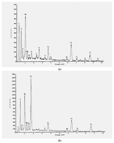 Figure 2 shows the SEM analysis results of the dust before and after ISV treatment. According to Figure 2, the surface of the dust appeared more compacted after undergoing the ISV process. Such a result corresponds to the studies of Gong et al. [19] and Pisciella et al. [5], which suggested that melting the waste could turn all hazardous substances into innocuous vapor and carbon dioxide. Furthermore, the melted ash became vitreous solids after cooling down, making the surface more compacted and impervious to hazardous substances [20]. Figure 3 shows the results of EDS analysis of the dust before and after ISV treatment, suggesting that after undergoing the ISV treatment, the highly contaminated dust experienced a pronounced decrease in or elimination of wave crests [4]. This result corresponds to that mentioned in Section 3.2, i.e., heavy metals in the dust were either encapsulated or bound in silicon lattices after ISV treatment and thus barely leached from the dust [4,9].