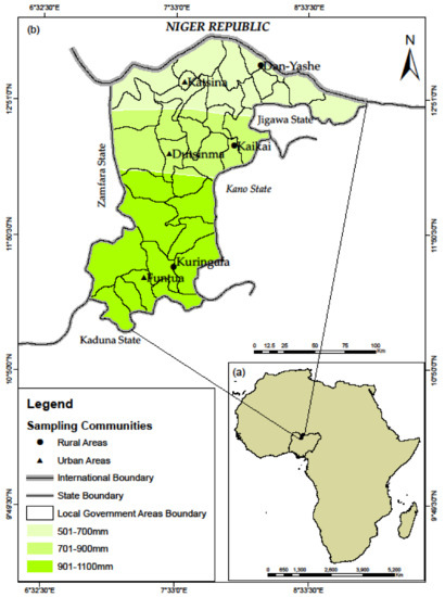 Furthermore, based on the longitudinal pattern of rainfall influence, the state is categorised into three extensive rainfall regions. These isohyets match up with the three existing ecological regions of the Guinea, Sudan and Sahel savannah regions in the south, central and north, respectively [40]. Figure 1a shows Africa comprising Nigeria including Katsina state; Figure 1b shows six investigated communities across the three different ecological (rainfall) regions in the state. The southern region of the state receives rainfall in the region of above 900 mm, while the central and northern regions receive between 700 and 900 mm, and below 700 mm, respectively.
