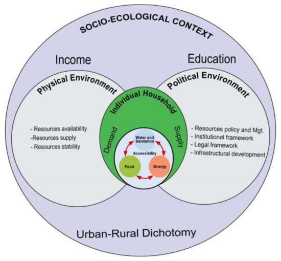 The model is constructed of four inter-related characteristics: individual household as well as socio-economic, physical and political environments. Socio-ecological parameters are not the only dominant ones, but they intersect with all of the other layers of influence; for example, the effects of location on urban–rural dichotomy influence access to household resources across the communities. Hence, it is constructed in accordance with the nexus perspective, which also draws attention to the need to adopt an integrated landscape or socio-ecological perspective, and the need for a broad conceptual framework linking the water-energy-food nexus to the larger sustainable development agenda.