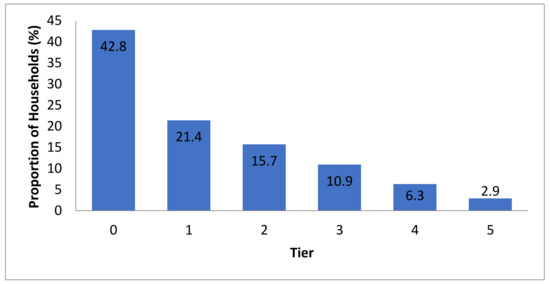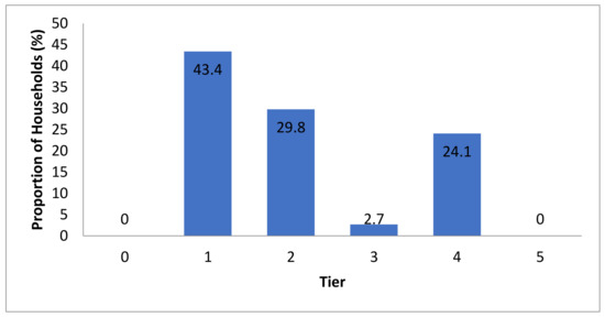 A multi-tier framework [45,50,51] was adopted to measure the proportion of the households’ access level to electricity and cooking energy. The Multi-Tier Framework (MTF) of the Global Traffic Framework (GTF) was developed to address the limitations of a binary energy access tool whereby a household was either categorised as having access or not [48,49]. The framework measures the level of electricity access and usage on the basis of these indicators: peak capacity, duration, reliability, quality, affordability, health and environmental safety. To measure cooking energy access, the framework was designed to analyse data in multiple dimensions of access and consists of six equal attributes: exposure and efficiency formed the two technical attributes while the other four contextual attributes capture the user’s experience in terms of convenience, affordability, safety and reliability. In order to measure progress, each attribute has six tiers ranging from 0 to 5, designated as no access, very low access, low access, limited access, high access and very high access, respectively. The method for assessing cooking energy with an overall tier rating is designed to be technology and fuel neutral, while reflecting the broad range of cooking solutions. Cooking solutions in the household are assessed based on the combination of six attributes of energy across six tiers (0–5), starting with access to basic solutions and increasing gradually to modern cooking solutions that deliver the highest results for all attributes. Each attribute is assessed independently and the overall tier for a household’s access to cooking solutions is obtained by summing-up the entire index of the six attributes using Equation (1).