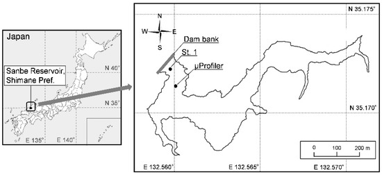 Study area in the Sanbe Reservoir, Japan, with field observation station (St.1), μ profiler. The map of Japan was generated by data from Geospatial Information Authority of Japan (https://www.gsi.go.jp/tizu-kutyu.html) (accessed on 1 January 2021).