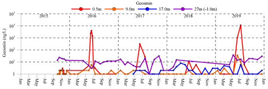 Figure 2 and Figure 3 show the changes of geosmin and 2-MIB concentration in time, respectively, at depths of 0.5 m, 9 m, 17 m, and 27 m below the surface of the water at St.1. The geosmin at the epilimnion (0.5 m depth from the water surface) was detected in values exceeding 100 ng L−1 in June 2016, June 2017, and June and July 2019, and also a high concentration of geosmin tended to occur in early summer (June to July). In contrast, 2-MIB at the epilimnion was detected in values exceeding 100 ng L−1 in November 2015, August and September 2017, and November 2019; moreover, a high concentration of 2-MIB tended to occur from summer to late autumn (August to November). However, in 2018, both geosmin and 2-MIB showed low concentrations below 10 ng L−1 (the Japanese standard for water quality). The geosmin was measured not only in the epilimnion but also at concentrations above 10 ng L−1 at the hypolimnion (1 m above the bottom) in the Sanbe Reservoir (Figure 2). In contrast, 2-MIB increased in the hypolimnion with a slight delay, specifically when the epilimnion increased (Figure 3). Moreover, the geosmin and 2-MIB concentrations decreased from the upper layer to the lower layer. However, as shown in the figure, the geosmin on 11 July 2016, as well as 2-MIB on 15 September 2017 and 12 November 2017, were confirmed near the bottom layer, although it was relatively low.