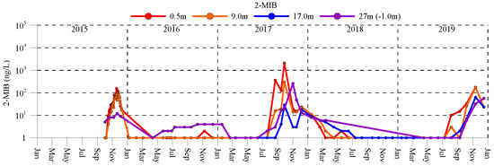 Figure 8 shows the relationship between geosmin, 2-MIB, and water temperature of surface water (0.5 m) in Sanbe Reservoir from October 2015 to December 2019. The presence of geosmin at a concentration of 10 ng L−1 or more was observed in a relatively narrow range of water temperature—from 20° to 25 °C. 2-MIB in this concentration was recorded in a much wider range of water temperatures—from 10° to 28 °C.