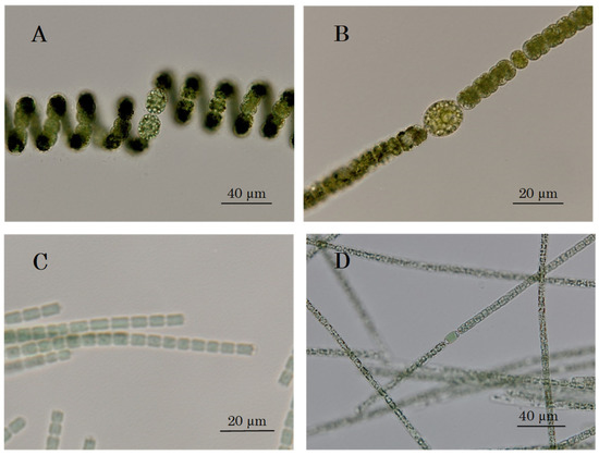 Morphological characteristics of musty-odor-producing cyanobacteria isolated from Sanbe Reservoir. (A) Dolichospermum crussum (geosmin-producing species): cell diameter of 8.5–11 µm. (B) Dolichospermum planctonicum (geosmin-producing species): cells diameter of 16.8–17.5 µm. (C) Pseudanabaena sp (2-MIB producing species): cells diameter of 1.5–1.7 µm. (D) Aphanizomenon cf. flos-aquae (2-MIB producing species): cells diameter of 4.6–5.0 µm.